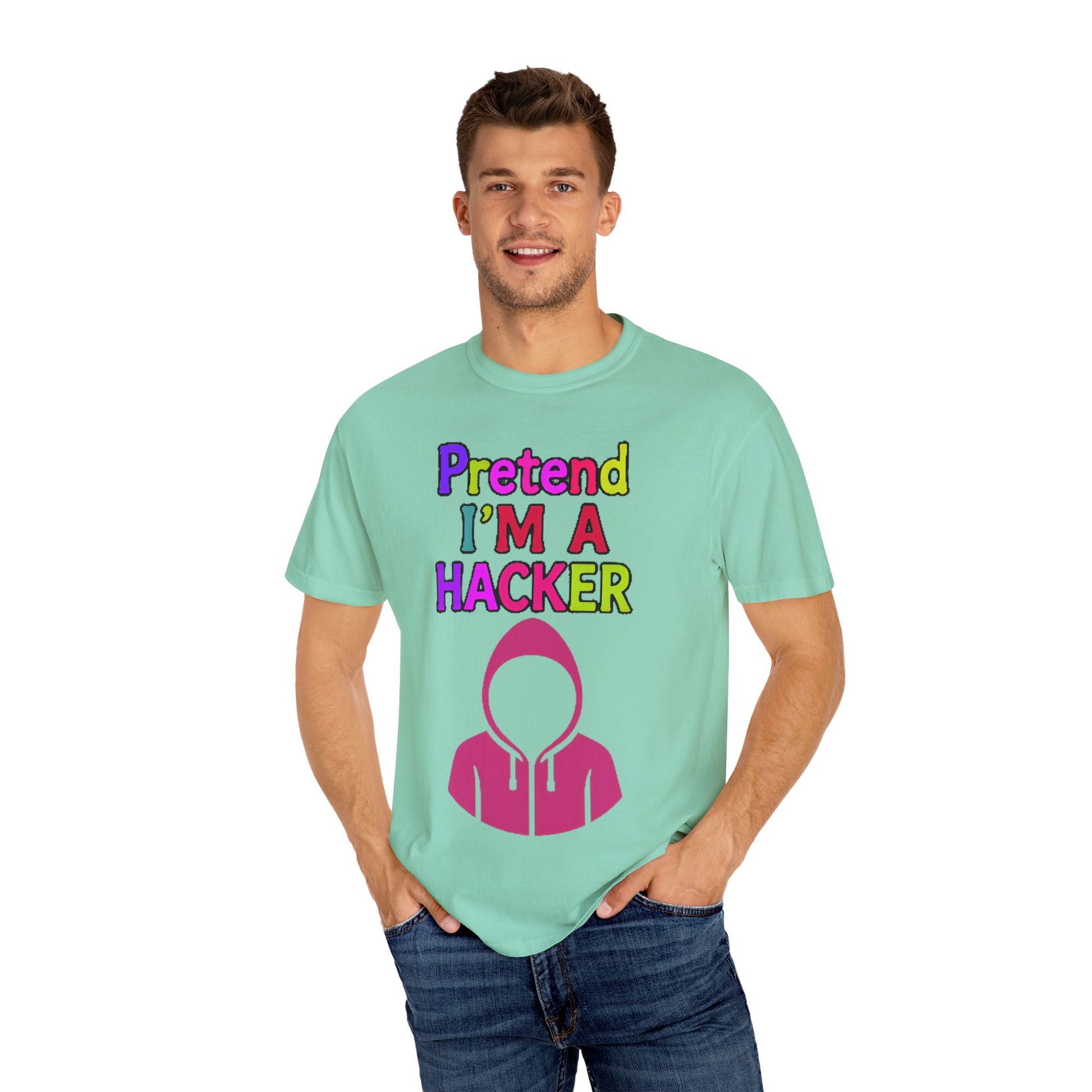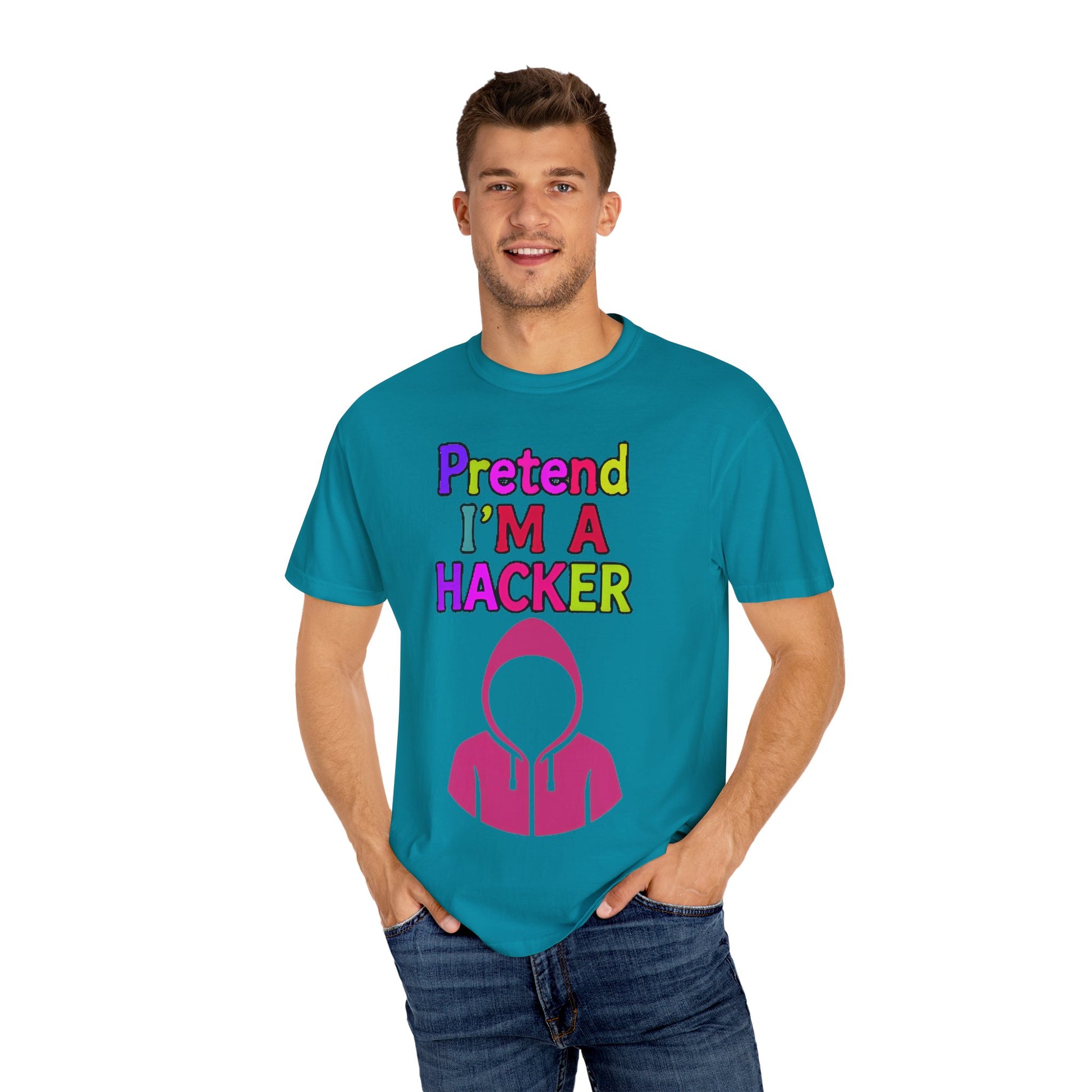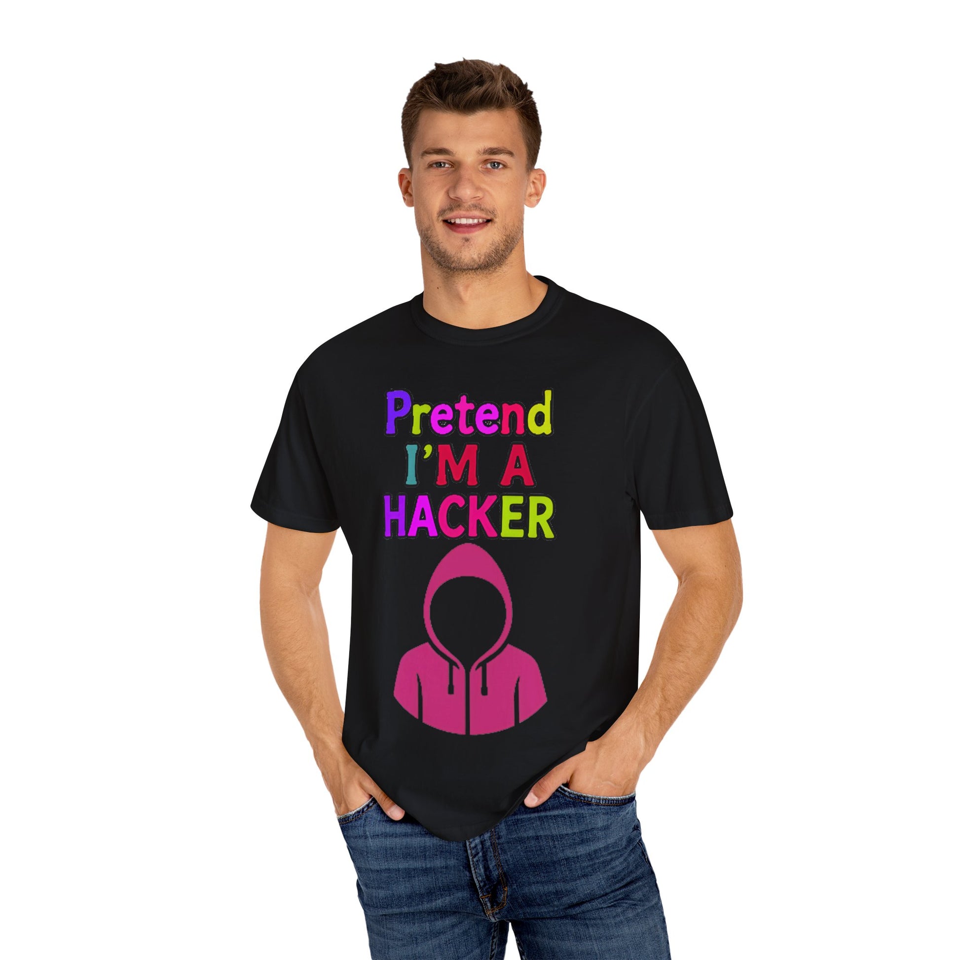 This unisex garment-dyed t-shirt features a design that says 'PRETEND I AM A HACKER,' giving off a cool and edgy vibe. It is perfect for those who enjoy casual and laid-back styles, and it can be a fun conversation starter for tech enthusiasts. This tee is ideal for everyday wear, casual outings, or themed parties related to technology or hacking.