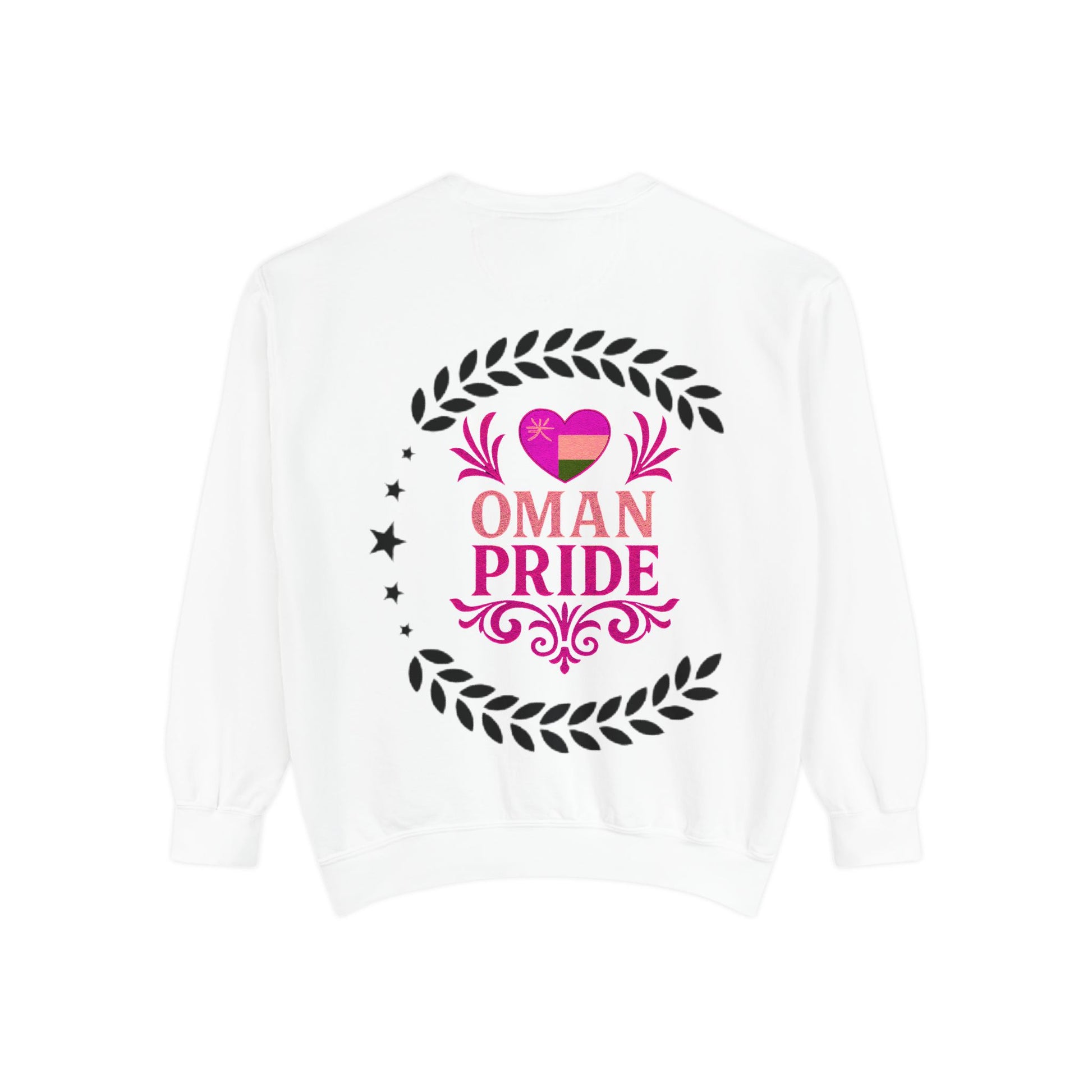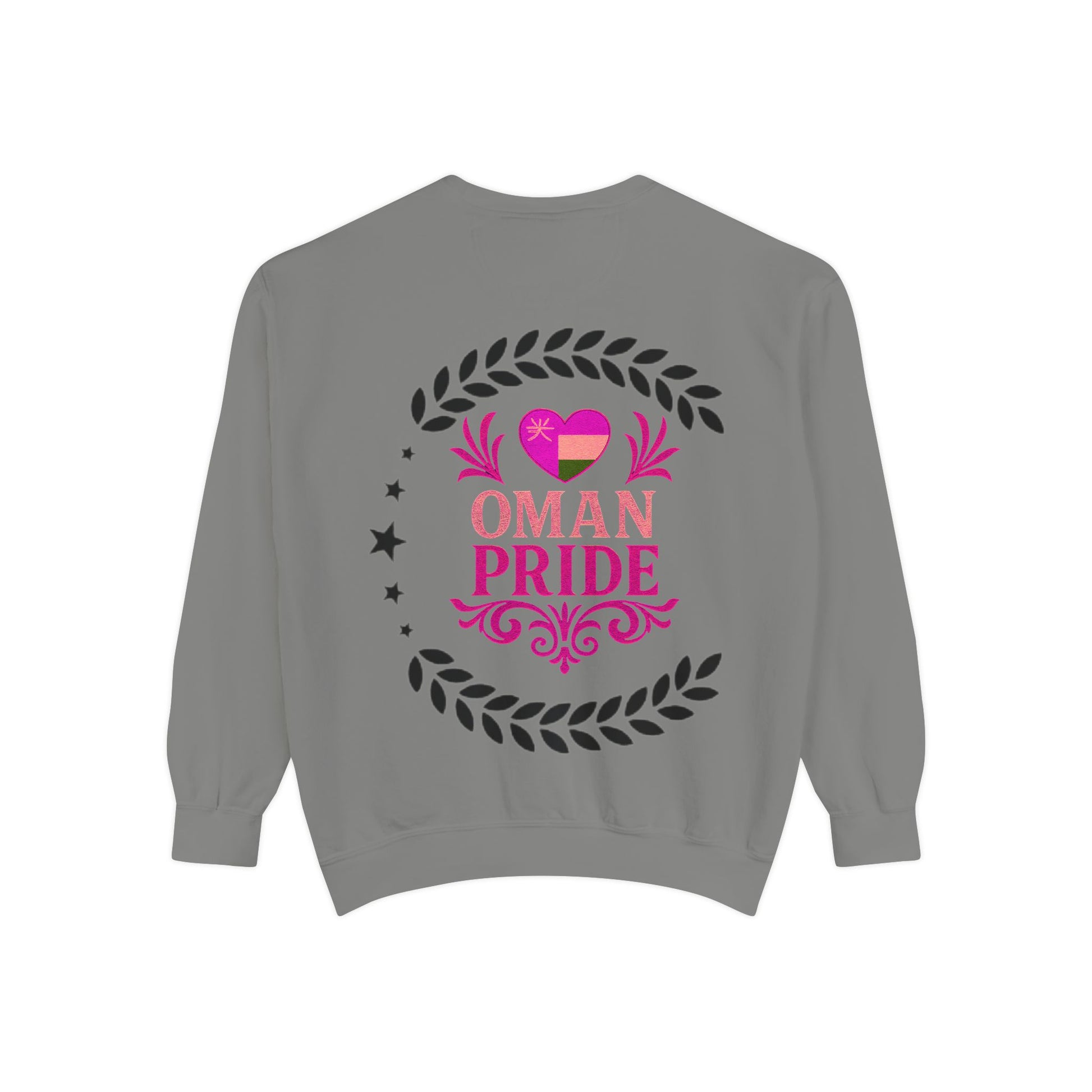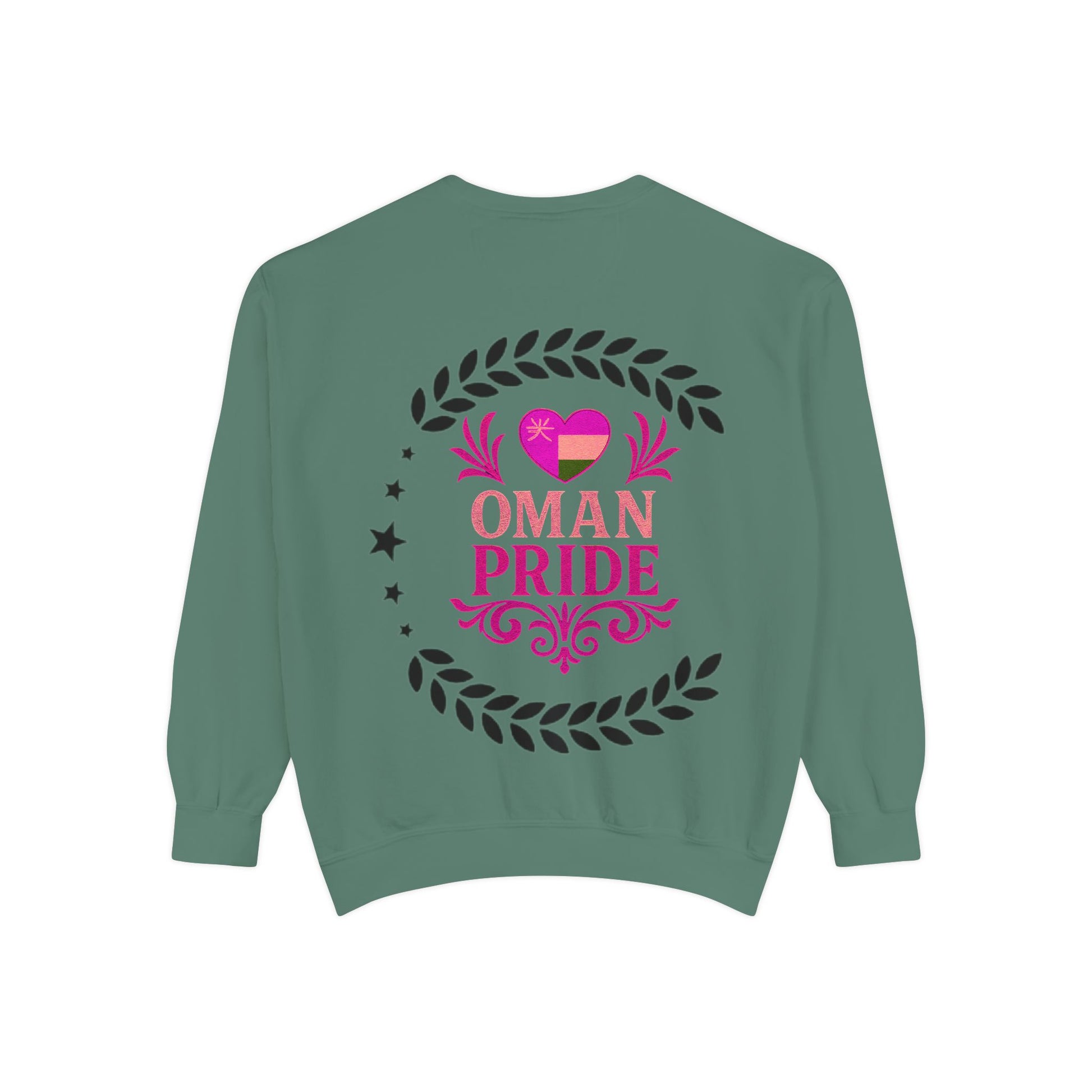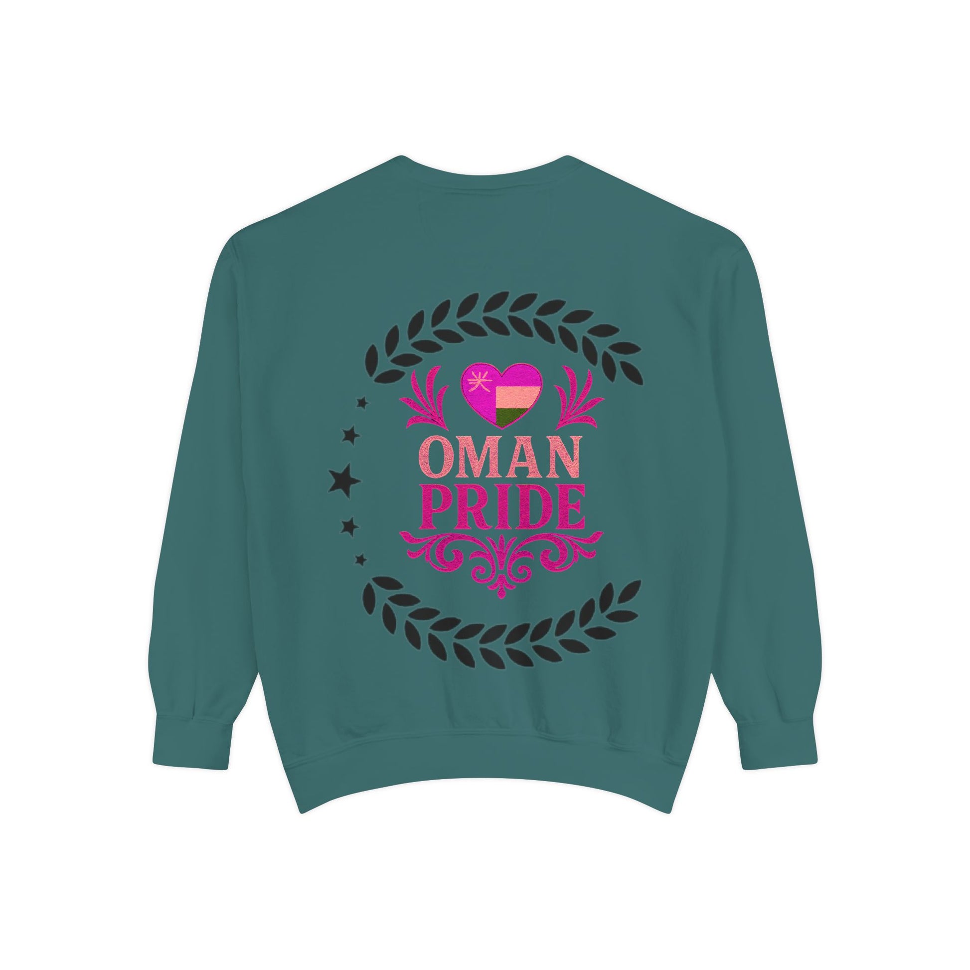 A cozy Unisex Garment-Dyed Sweatshirt showcasing OMAN PRIDE. Made of 80% cotton and 20% polyester with a relaxed fit and medium-heavy fabric. Perfect for those who want to show their OMAN pride in a comfortable and stylish way. Ideal for celebrating Omani holidays and events.