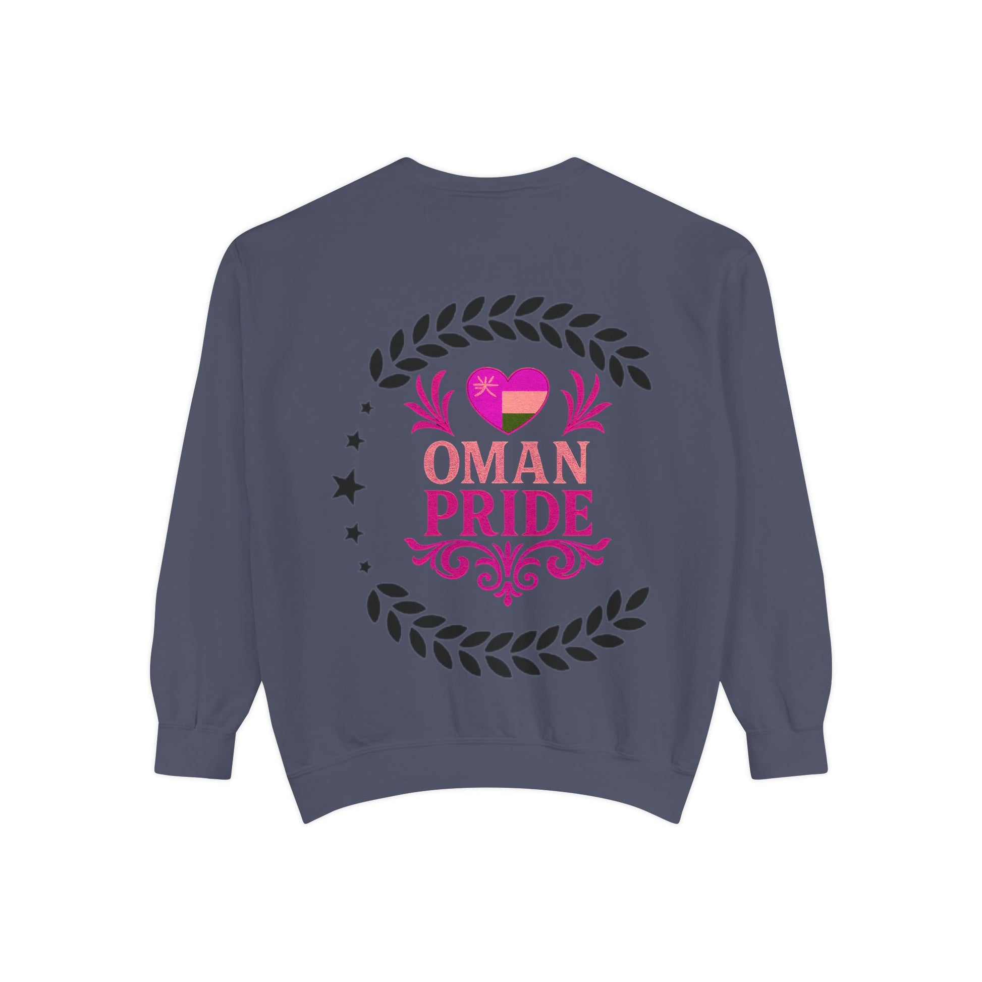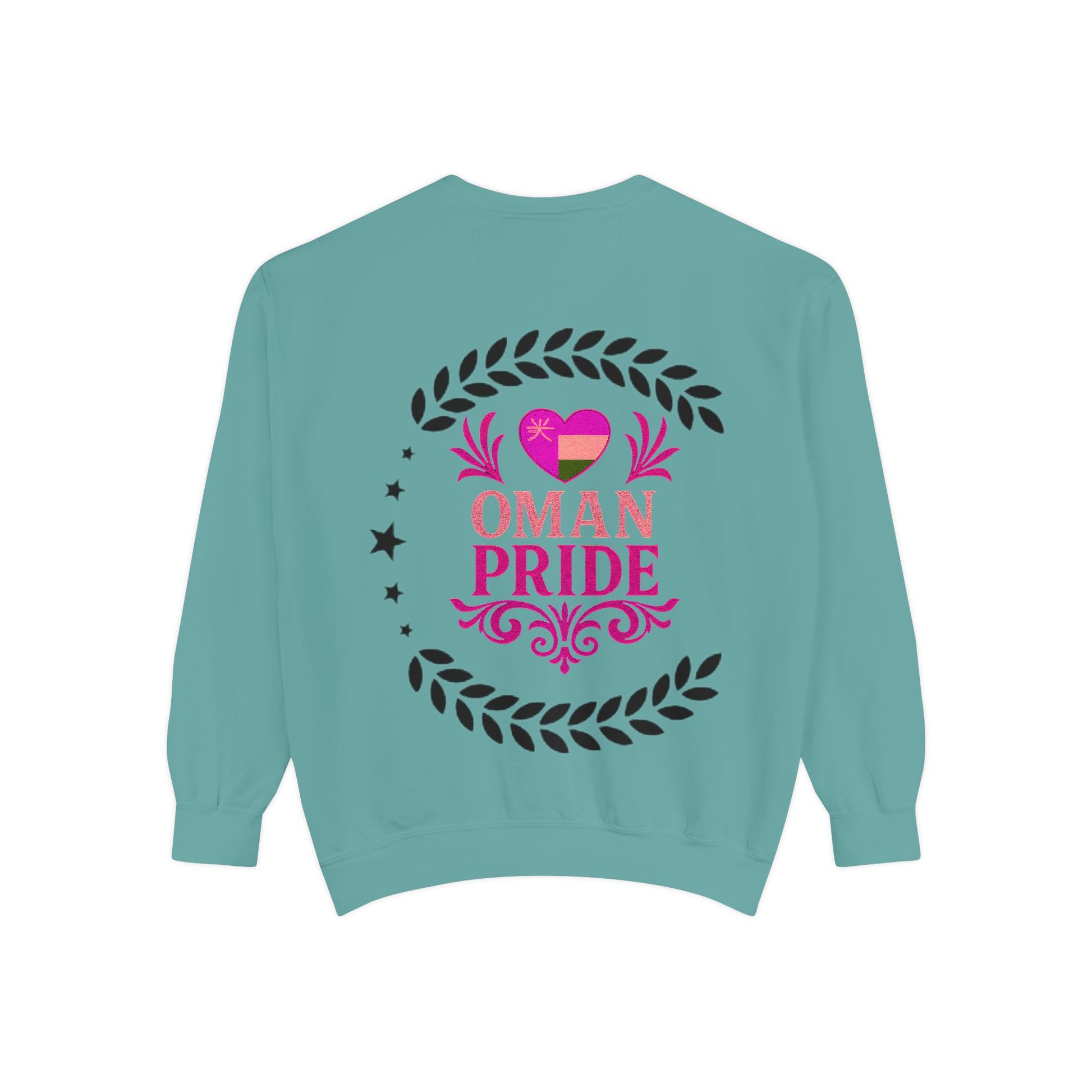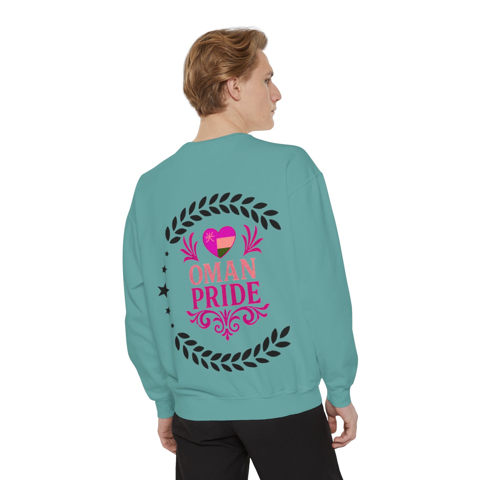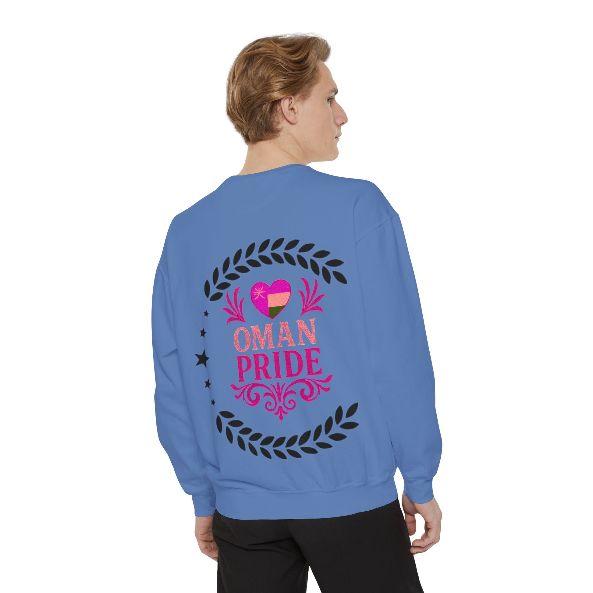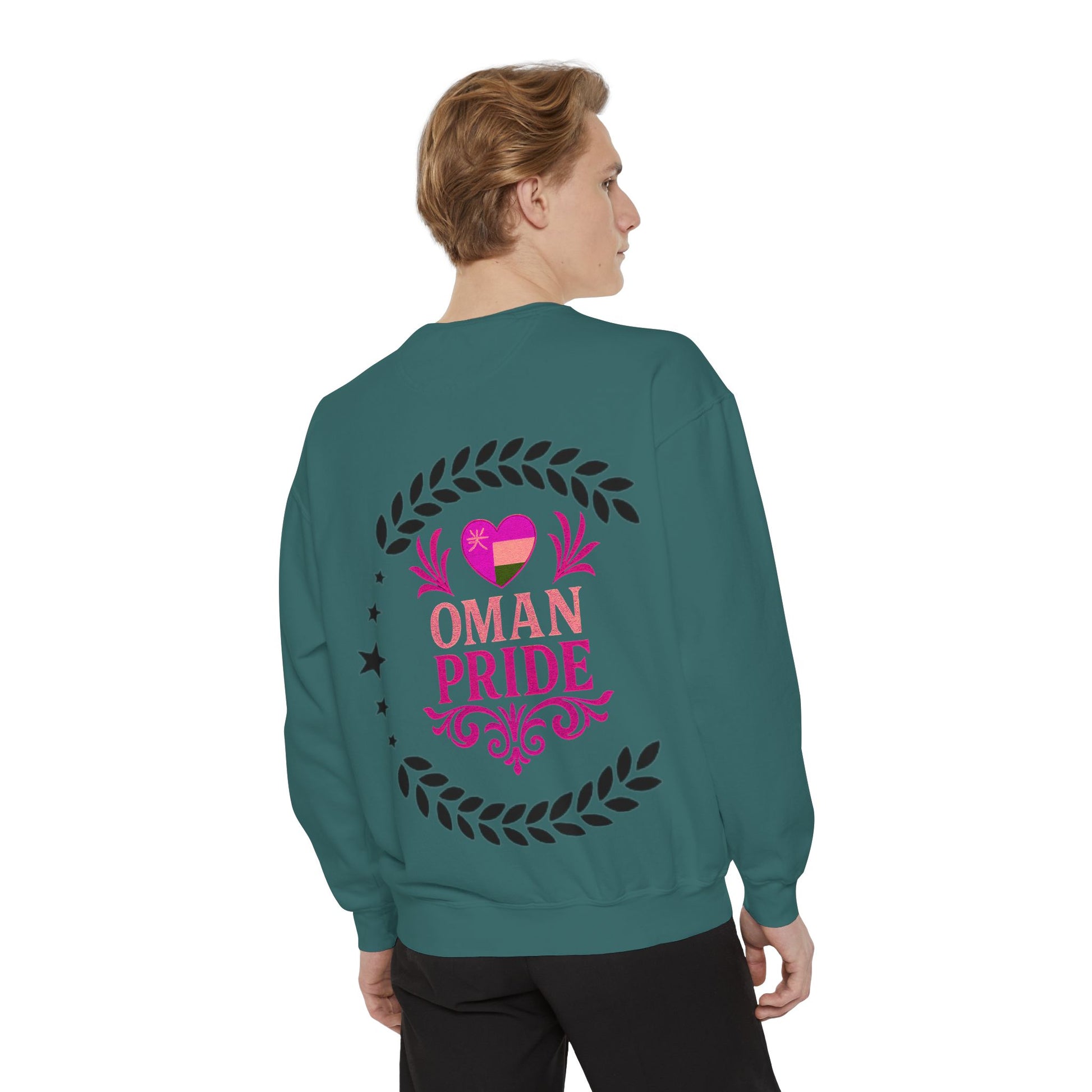 A cozy Unisex Garment-Dyed Sweatshirt showcasing OMAN PRIDE. Made of 80% cotton and 20% polyester with a relaxed fit and medium-heavy fabric. Perfect for those who want to show their OMAN pride in a comfortable and stylish way. Ideal for celebrating Omani holidays and events.