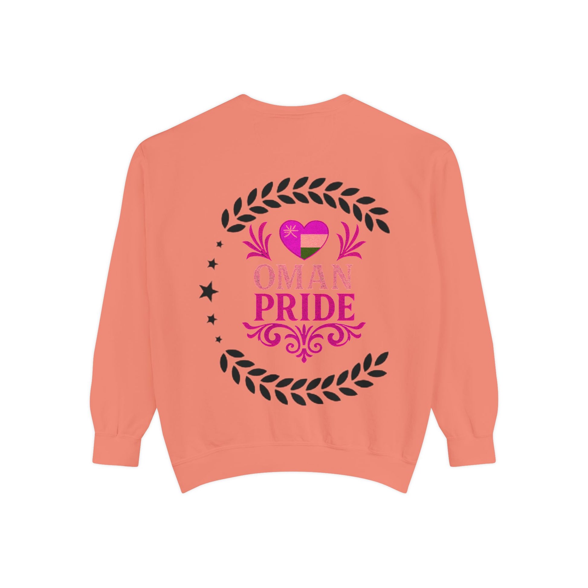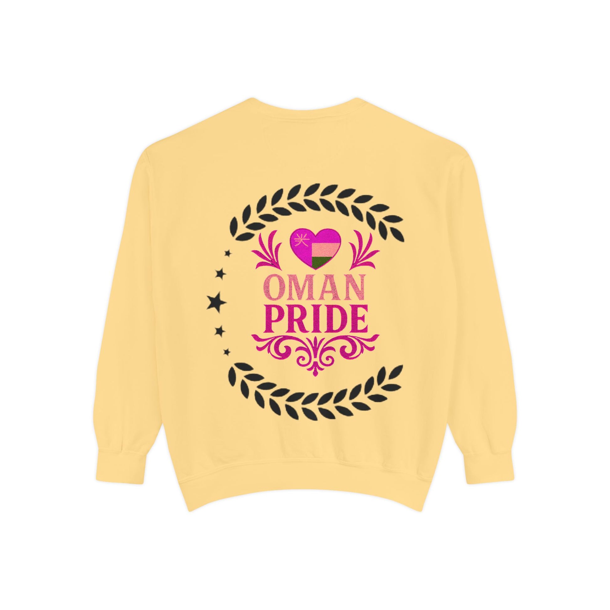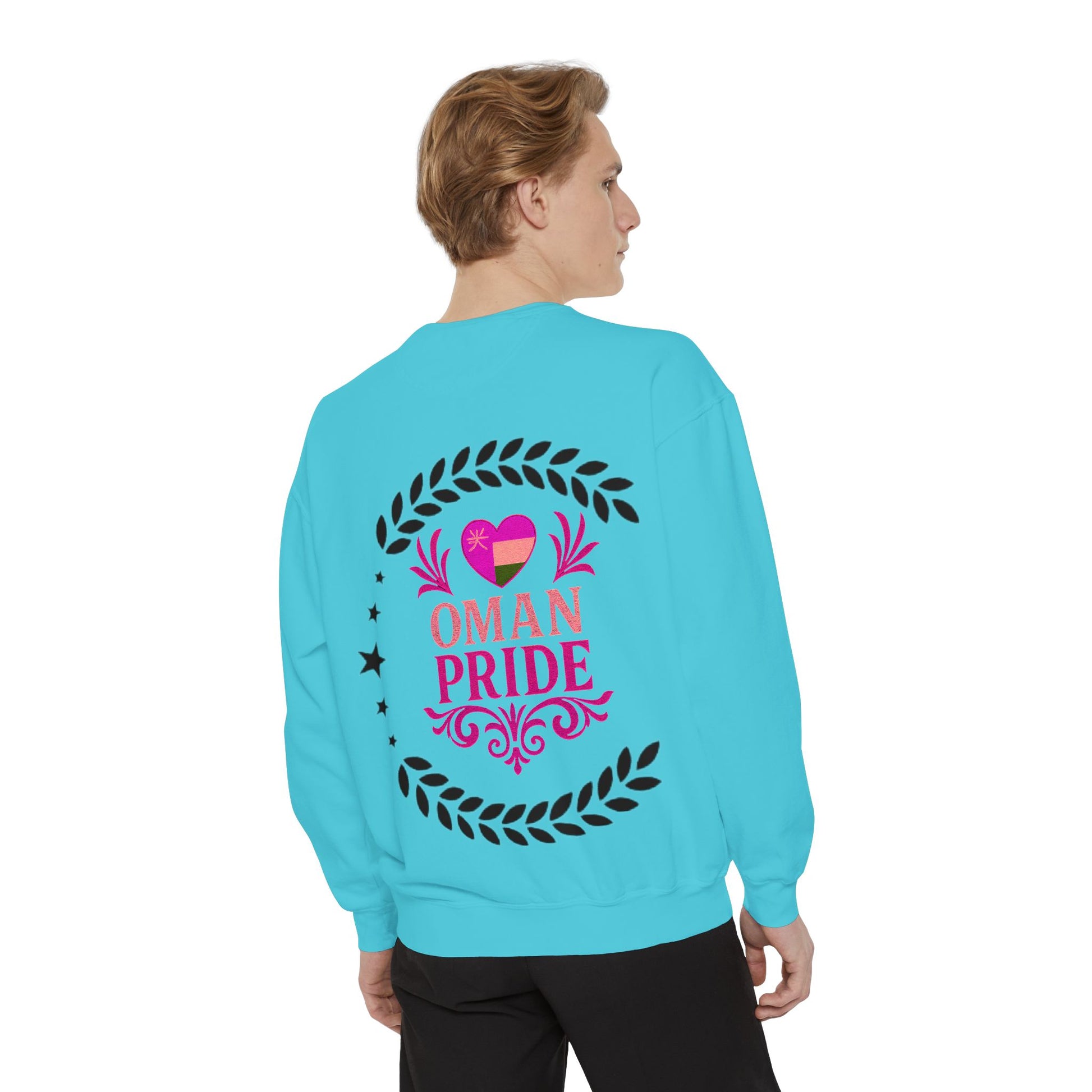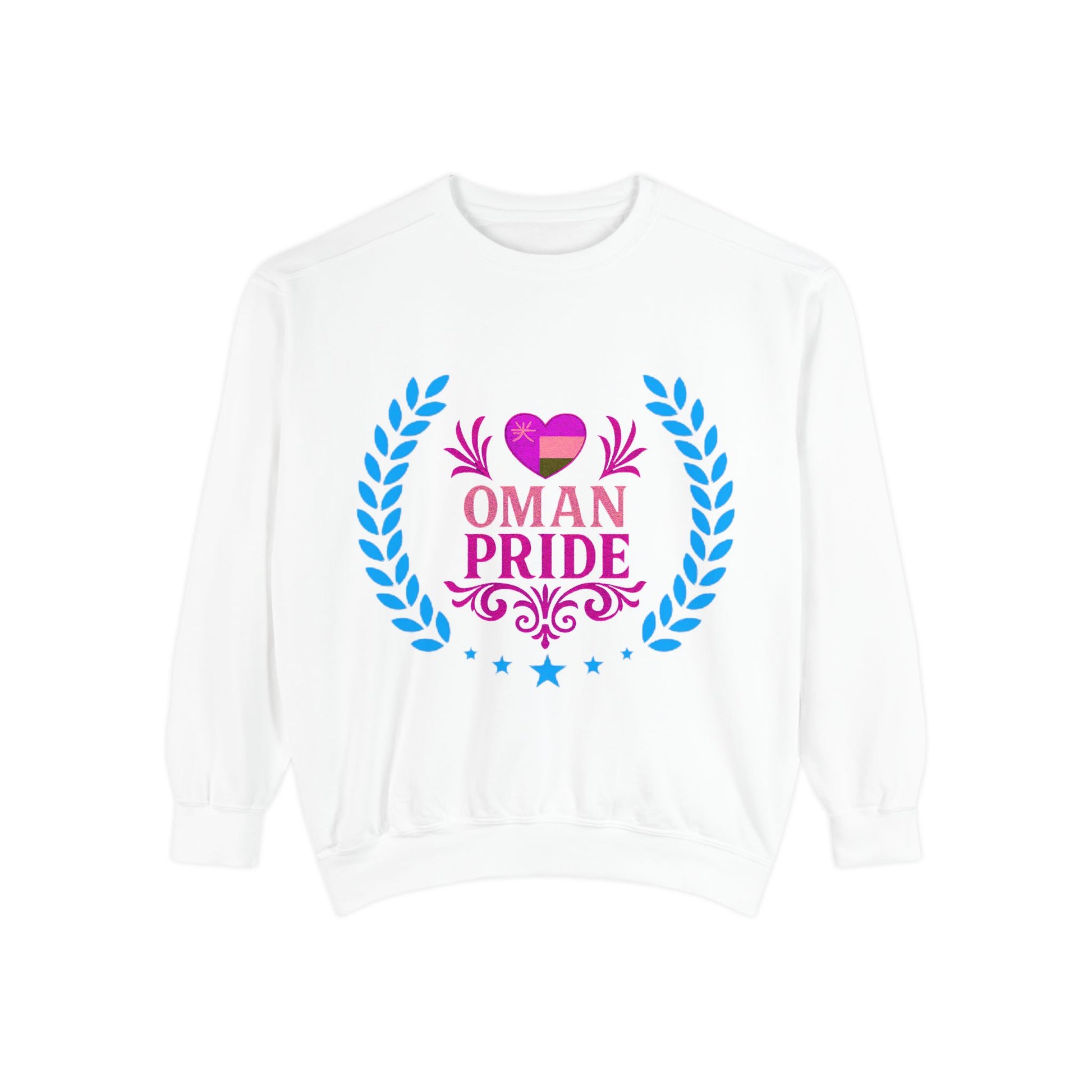 A cozy Unisex Garment-Dyed Sweatshirt showcasing OMAN PRIDE. Made of 80% cotton and 20% polyester with a relaxed fit and medium-heavy fabric. Perfect for those who want to show their OMAN pride in a comfortable and stylish way. Ideal for celebrating Omani holidays and events.