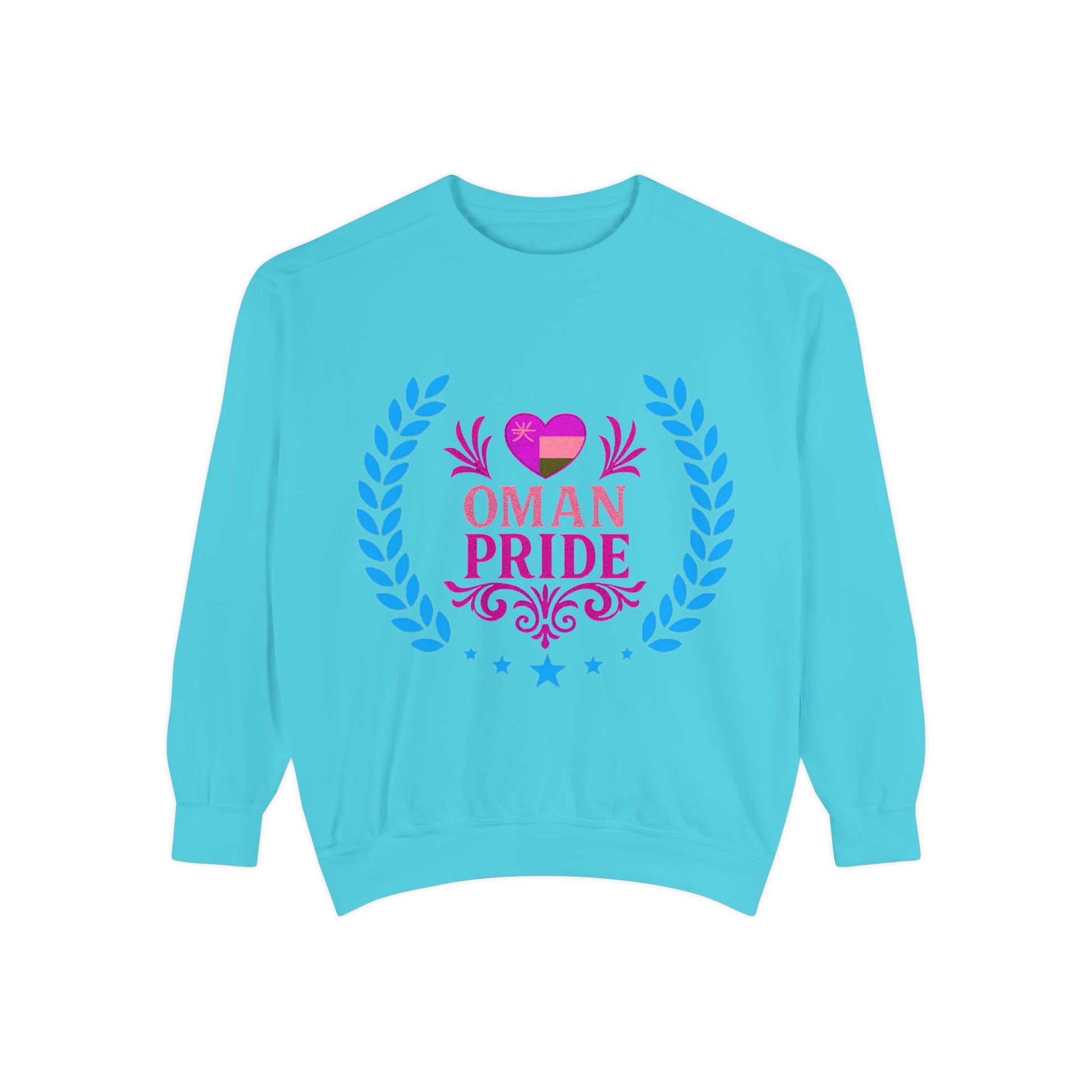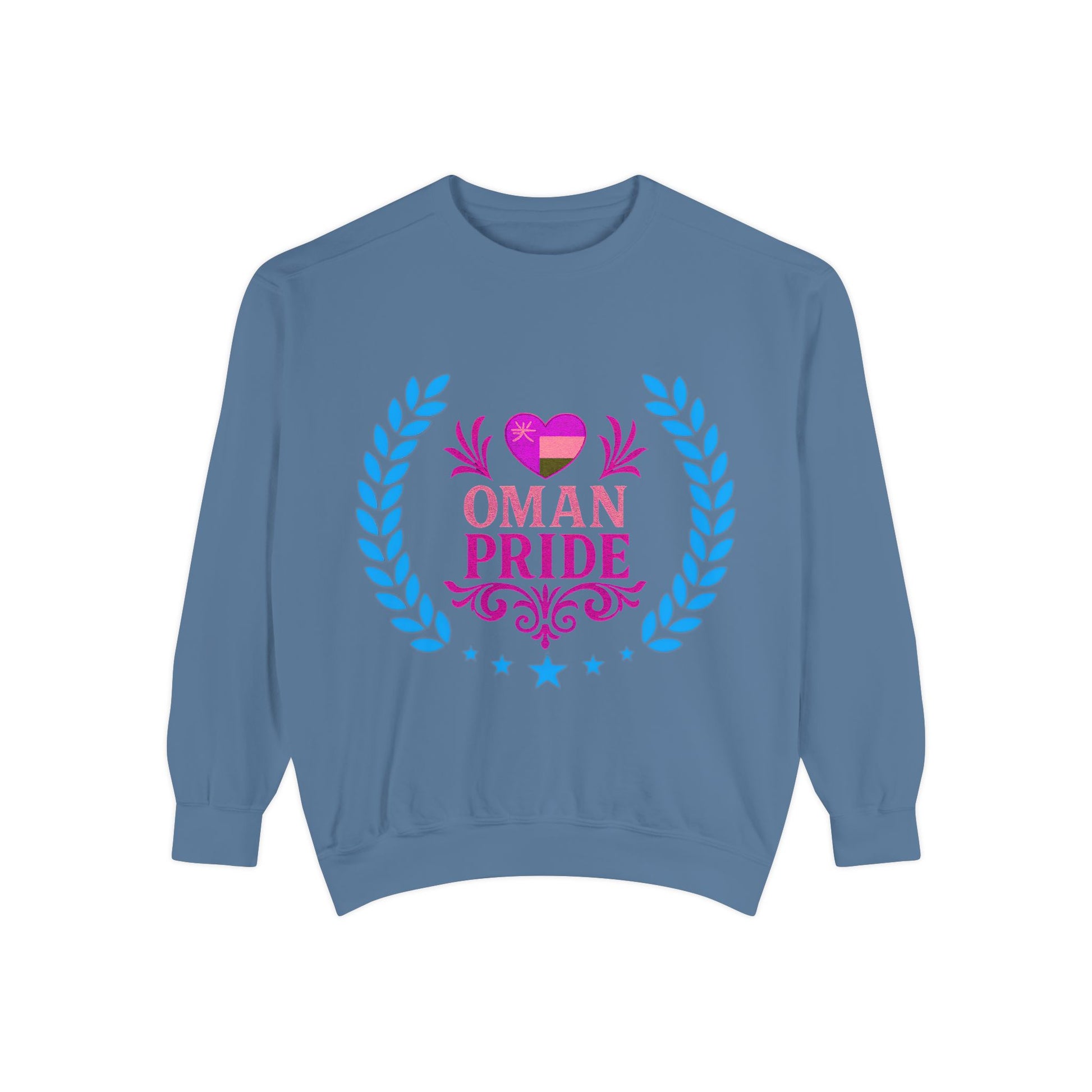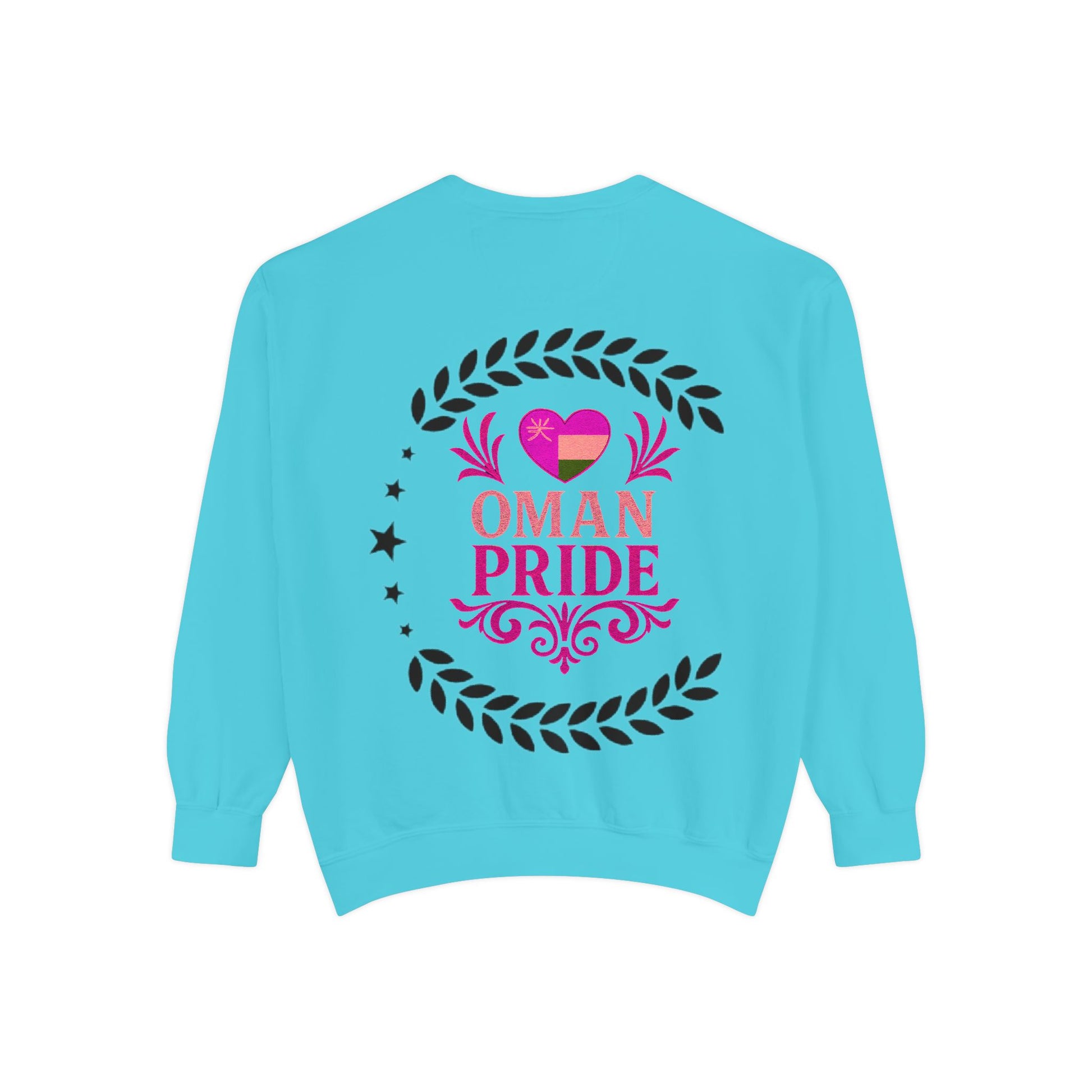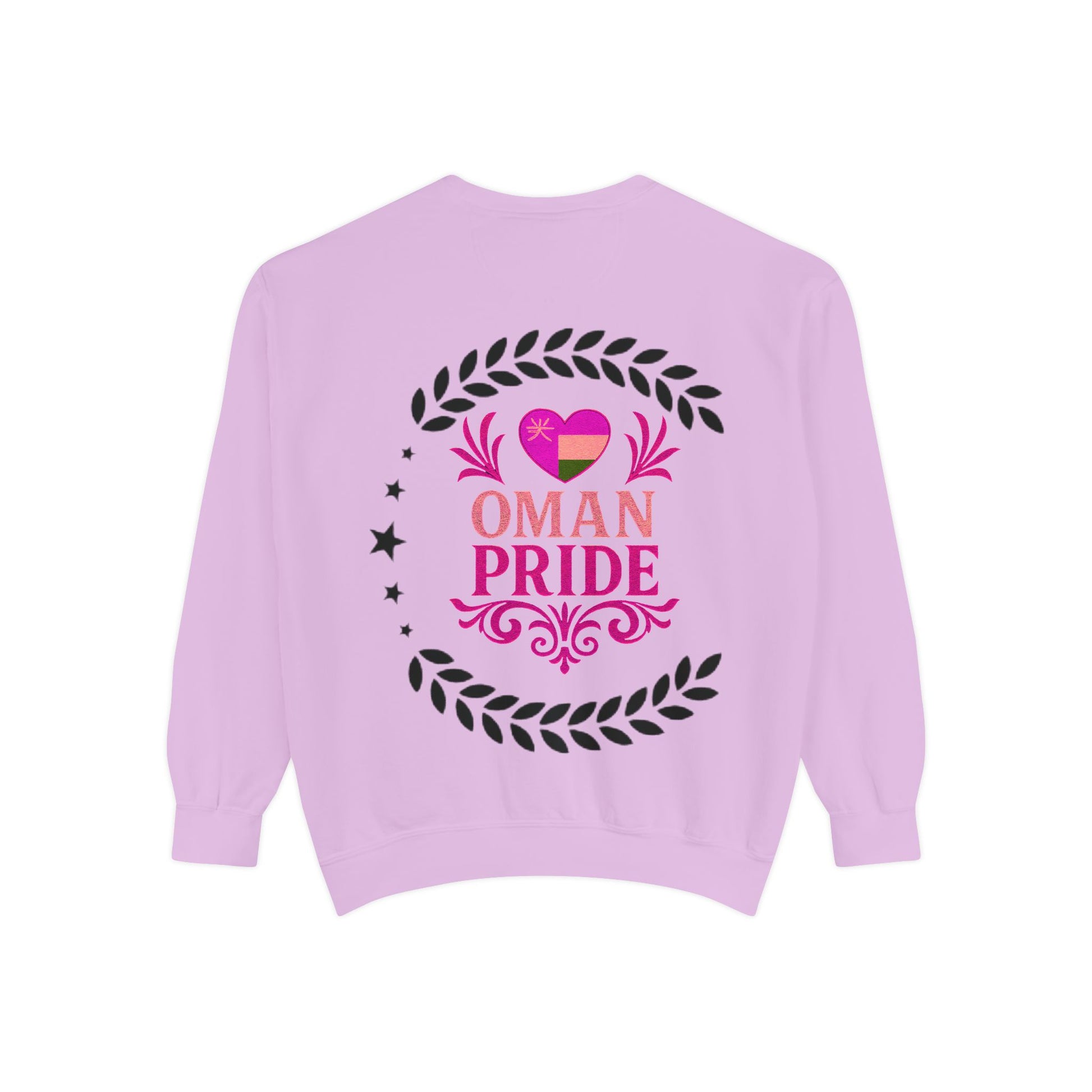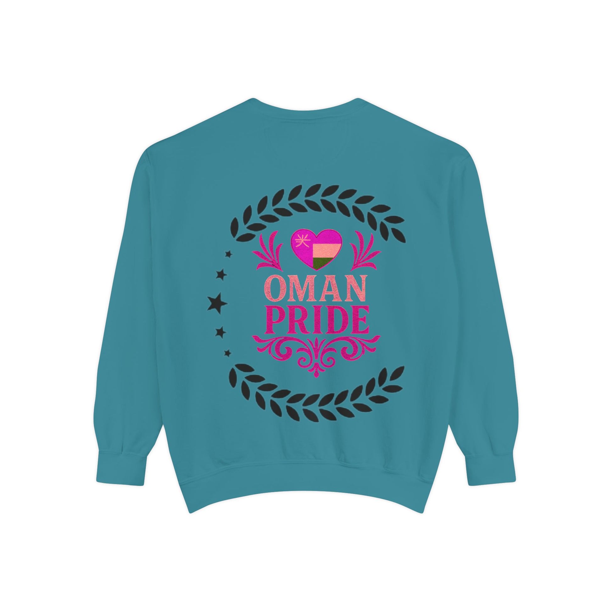 A cozy Unisex Garment-Dyed Sweatshirt showcasing OMAN PRIDE. Made of 80% cotton and 20% polyester with a relaxed fit and medium-heavy fabric. Perfect for those who want to show their OMAN pride in a comfortable and stylish way. Ideal for celebrating Omani holidays and events.